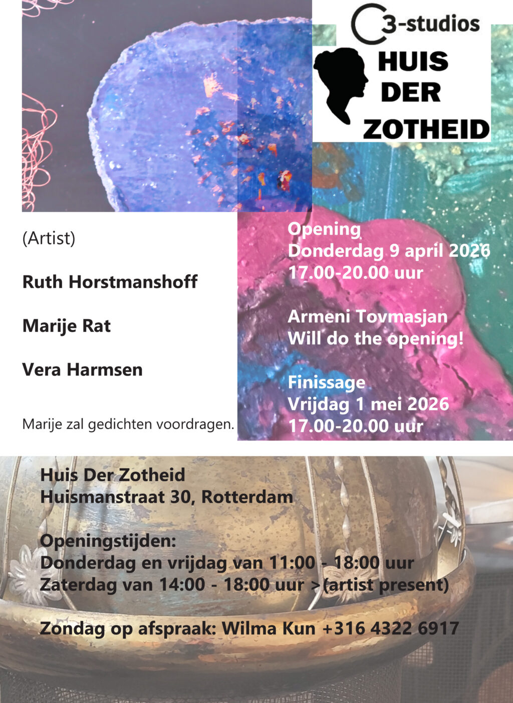 Enghish below Graag nodig ik je uit voor de Opening in Huis der Zotheid kunstpodium. We presenteert werk van Ruth Horstmanshoff / Marije Rat / Vera Harmsen. De tentoonstelling wordt geopend[…]