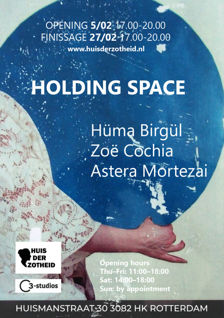 We would like to invite you to “Holding Space” at Huis der Zotheid art podium . We presents Hüma Birgül/ ZoëCocchia / Astera Mortezai.  It would be great if you could be there!