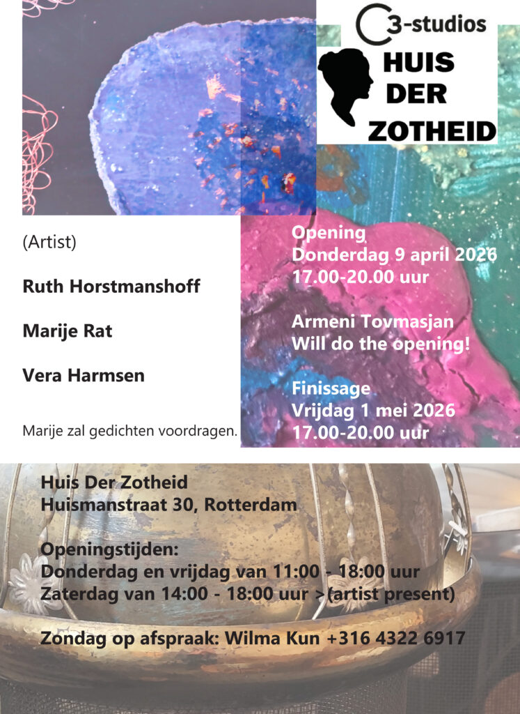 Graag nodig ik je uit voor de Opening in Huis der Zotheid kunstpodium. We presenteert werk van Ruth Horstmanshoff / Marije Rat / Vera Harmsen. De tentoonstelling wordt geopend door Armeni Tovmasjan. Leuk als je er bij kan zijn!